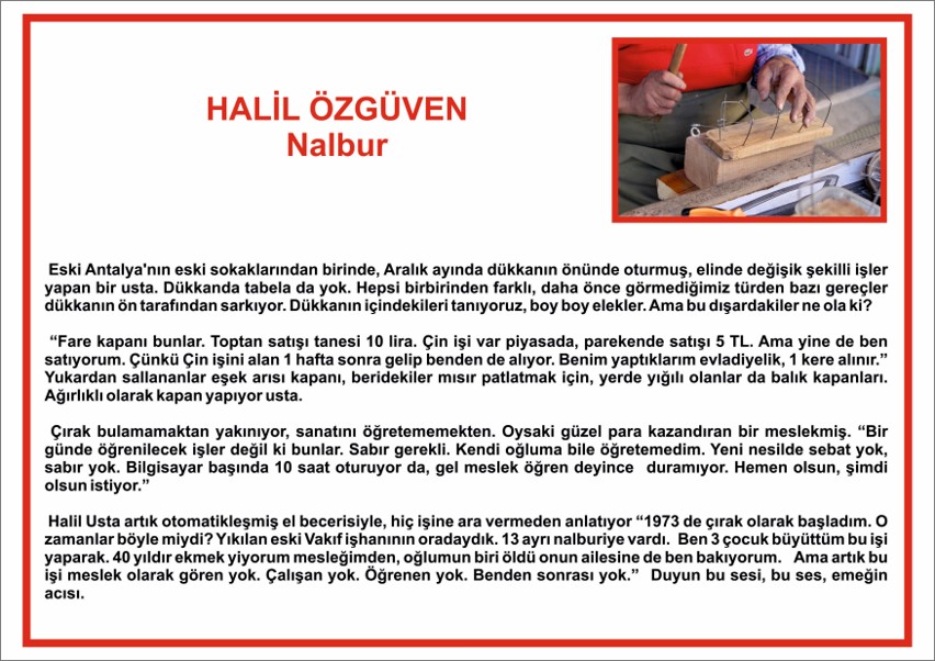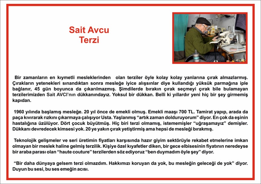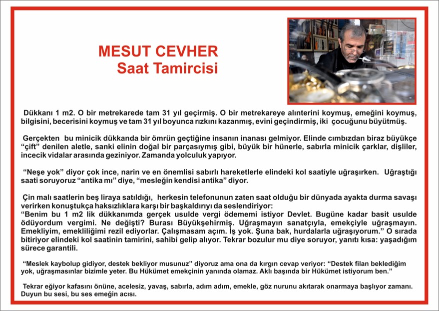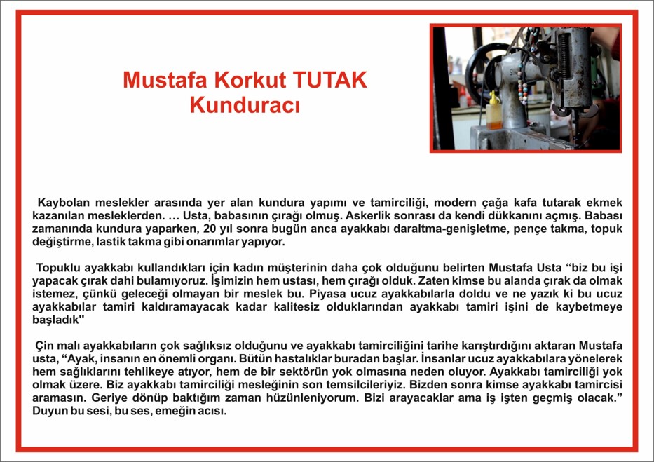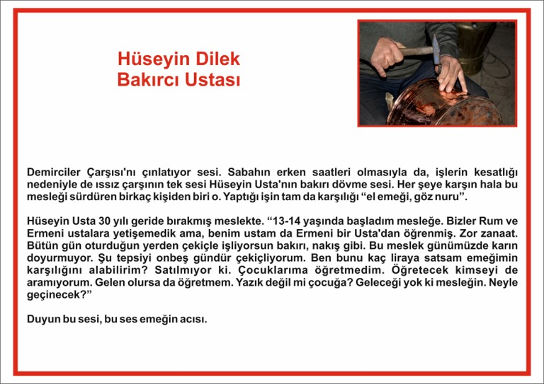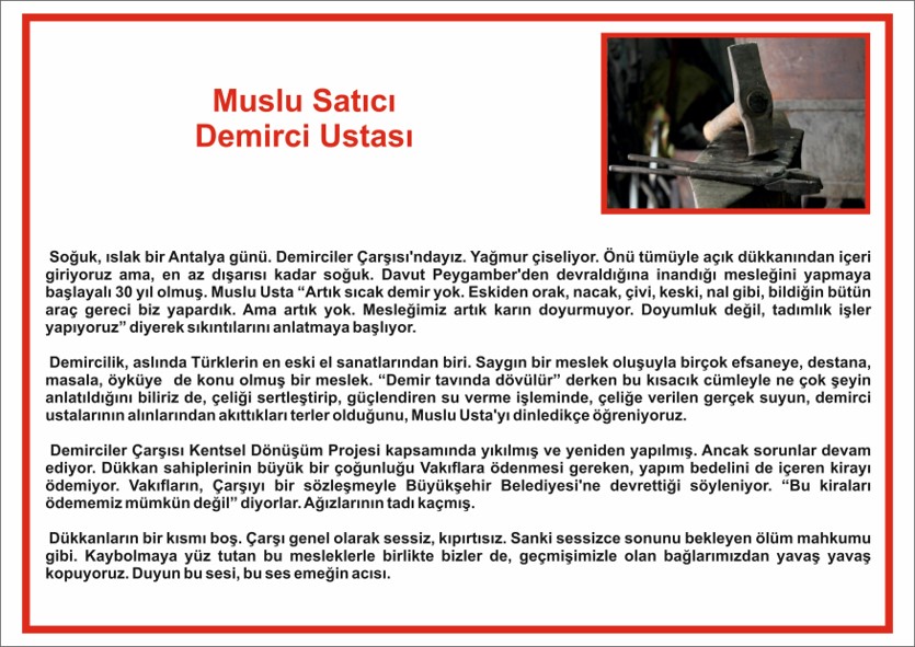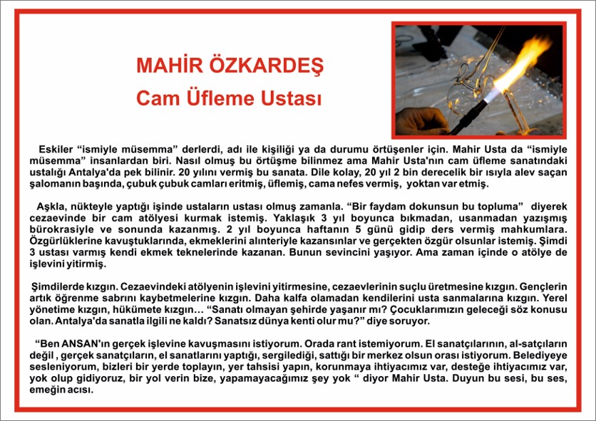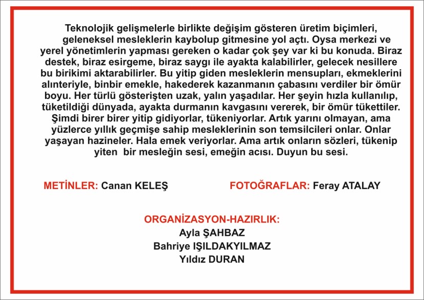 Kaybolmakta olan meslek mensubu emekçilerin sesi olarak, sorunlarını gündeme taşımak ve toplumsal farkındalık yaratmak. Bu amaçla belirlenen yoğun emek ve beceri isteyen meslek mensuplarıyla röportaj yapmak, fotoğraflamak, bunların basımını sağlayarak, bir sergi düzenlemek. Sergide bu meslek mensuplarına da yer vermek ve canlı performanslarla toplumsal duyarlılık ve farkındalık yaratmak Hedefiyle gerçekleştirilen Emeğin Acısı adlı Foto Röportaj sergisi izleyicileri ile Antalya Aydın Kanza Parkında buluştu.
