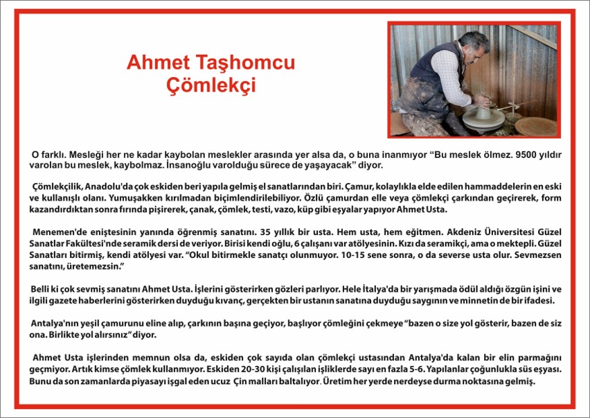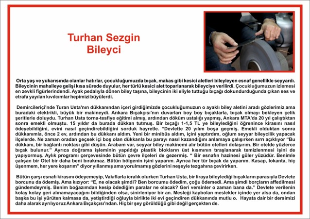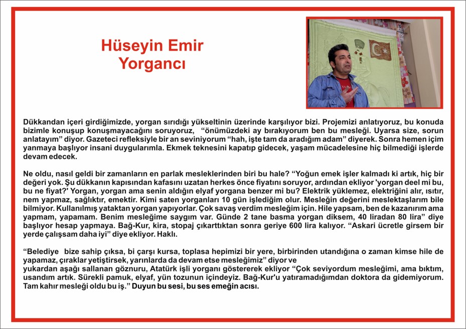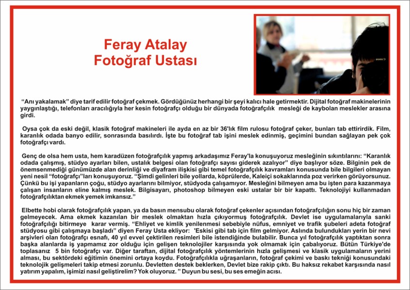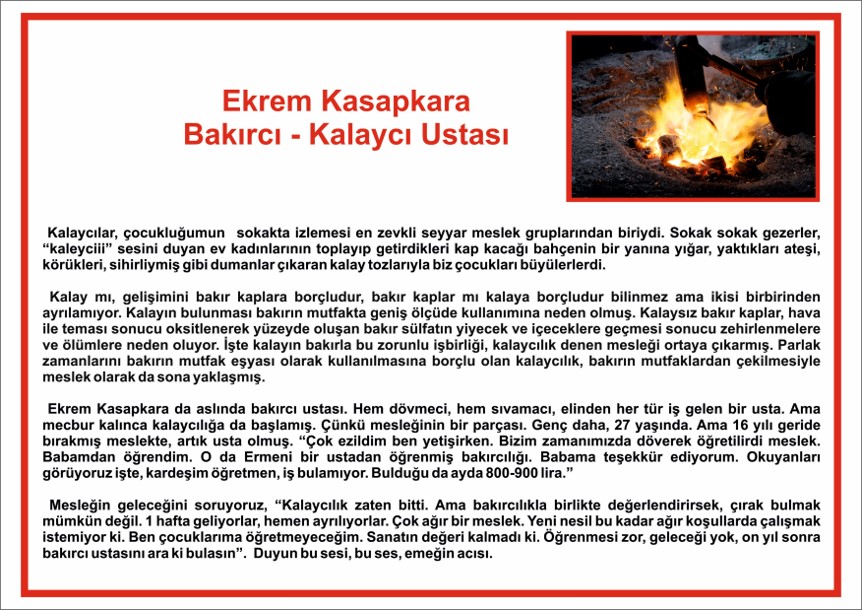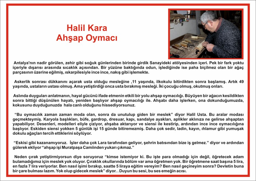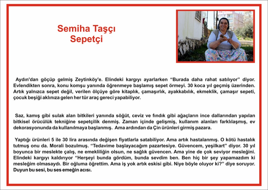 Kaybolmakta olan meslek mensubu emekçilerin sesi olarak, sorunlarını gündeme taşımak ve toplumsal farkındalık yaratmak. Bu amaçla belirlenen yoğun emek ve beceri isteyen meslek mensuplarıyla röportaj yapmak, fotoğraflamak, bunların basımını sağlayarak, bir sergi düzenlemek. Sergide bu meslek mensuplarına da yer vermek ve canlı performanslarla toplumsal duyarlılık ve farkındalık yaratmak Hedefiyle gerçekleştirilen Emeğin Acısı adlı Foto Röportaj sergisi izleyicileri ile Antalya Aydın Kanza Parkında buluştu.
